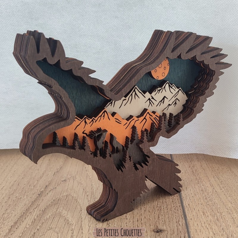Apportez une ambiance naturelle et chaleureuse à votre intérieur grâce à cette sculpture décorative en bois représentant un aigle en plein vol. À l’intérieur de sa silhouette se dévoile un paysage de montagne détaillé, composé de sommets enneigés, d’une forêt de sapins et d’un soleil couchant.