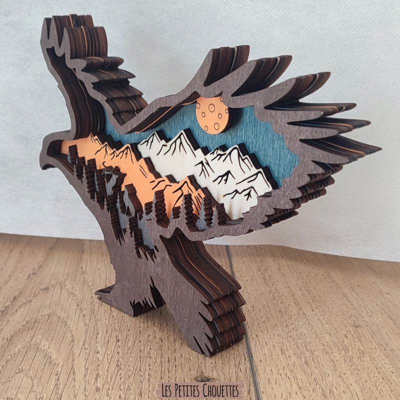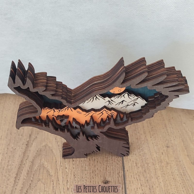 Cette sculpture aigle en bois avec paysage montagne est une pièce décorative unique qui apportera une touche d’évasion et de caractère à votre intérieur.