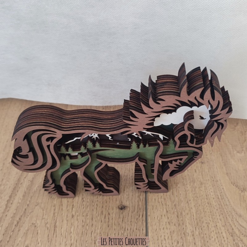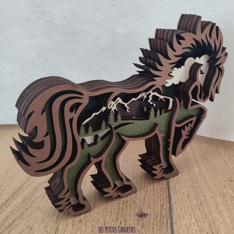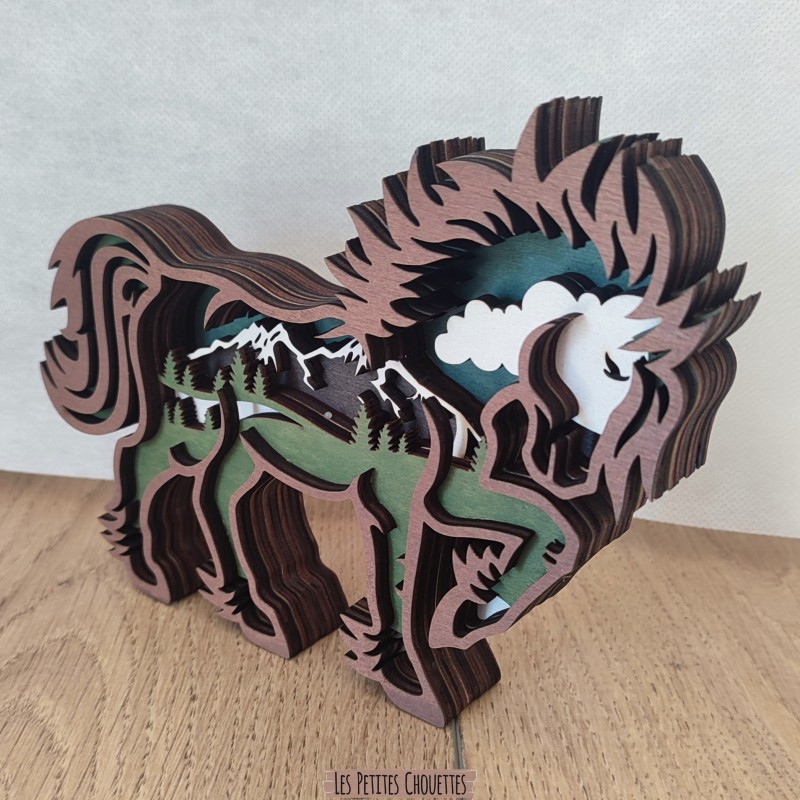 Magnifique décoration en bois représentant un Cheval majestueux intégrant un paysage de montagne, de forêt et de rivière en plusieurs couches découpées au laser.