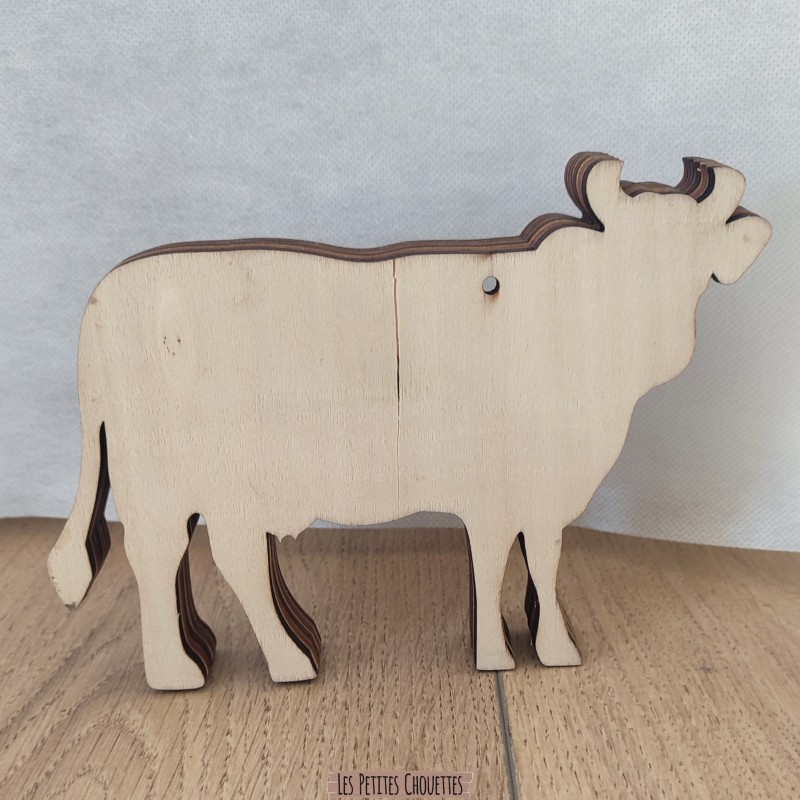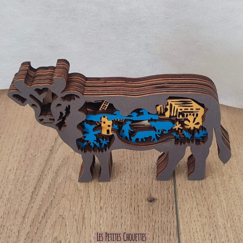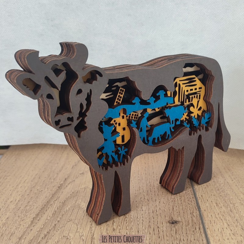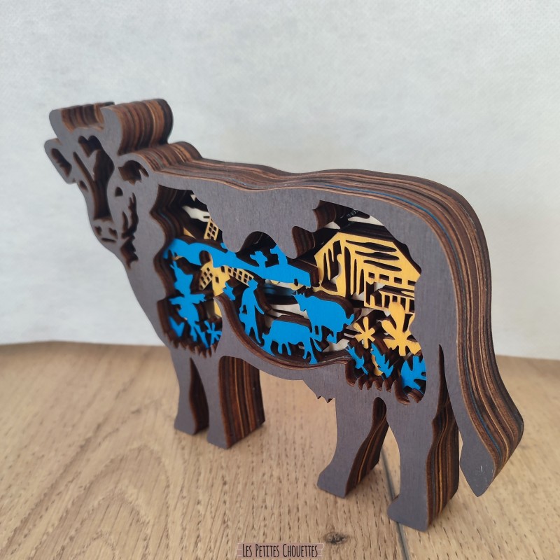 Magnifique décoration en bois représentant une Vache magnifique intégrant un paysage de campagne, de ferme et de rivière en plusieurs couches découpées au laser.