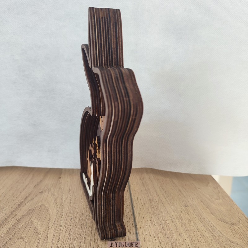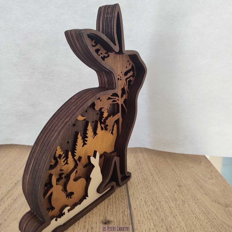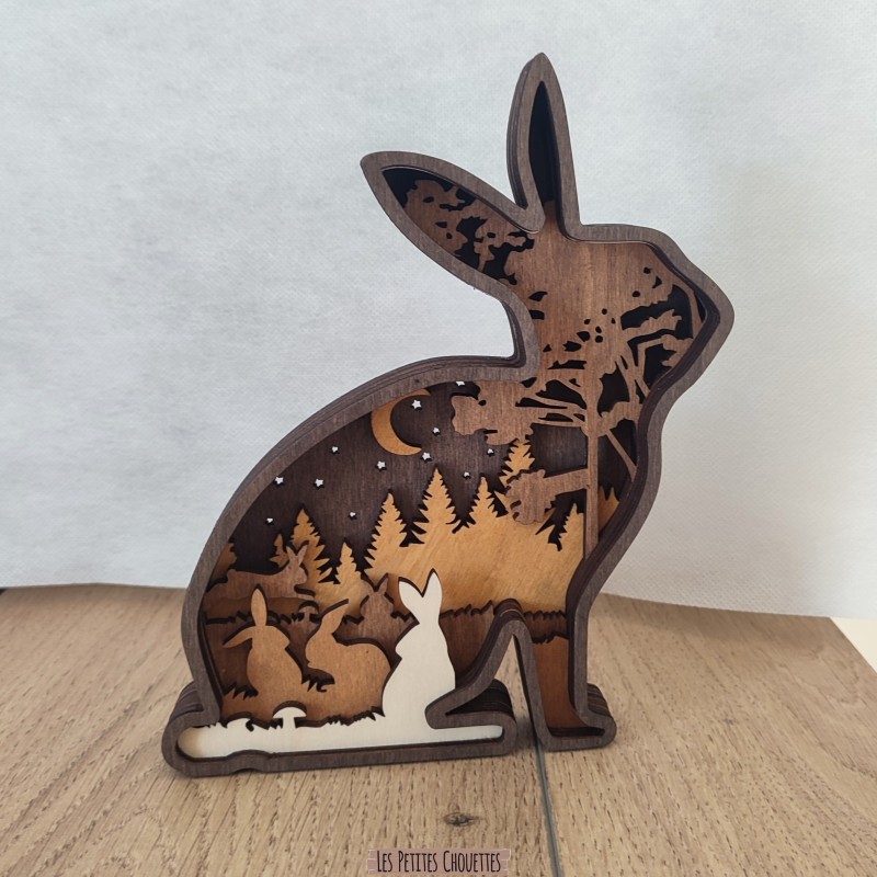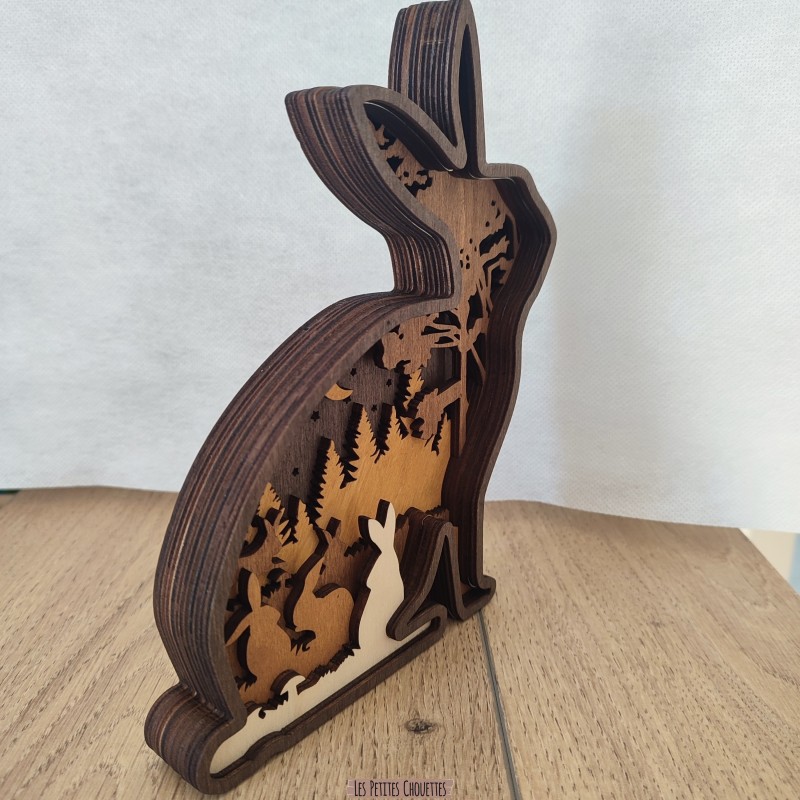 Réalisé à partir de plusieurs couches de bois découpées avec précision au laser, ce Lapin dévoile en son intérieur un magnifique paysage de forêt avec arbres, Lapin, lune, végétation et reliefs qui créent un effet de profondeur très esthétique. Les différentes teintes de bois et la touche de couleur marron apportent une ambiance douce et chaleureuse.