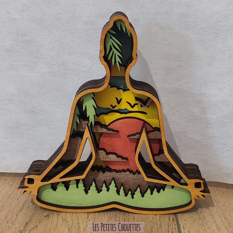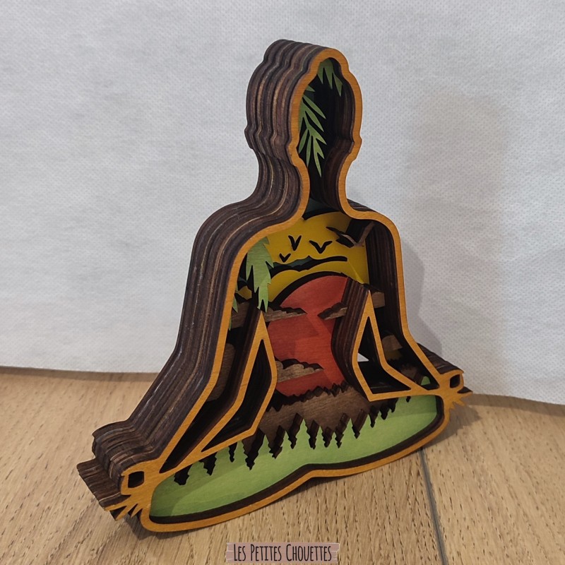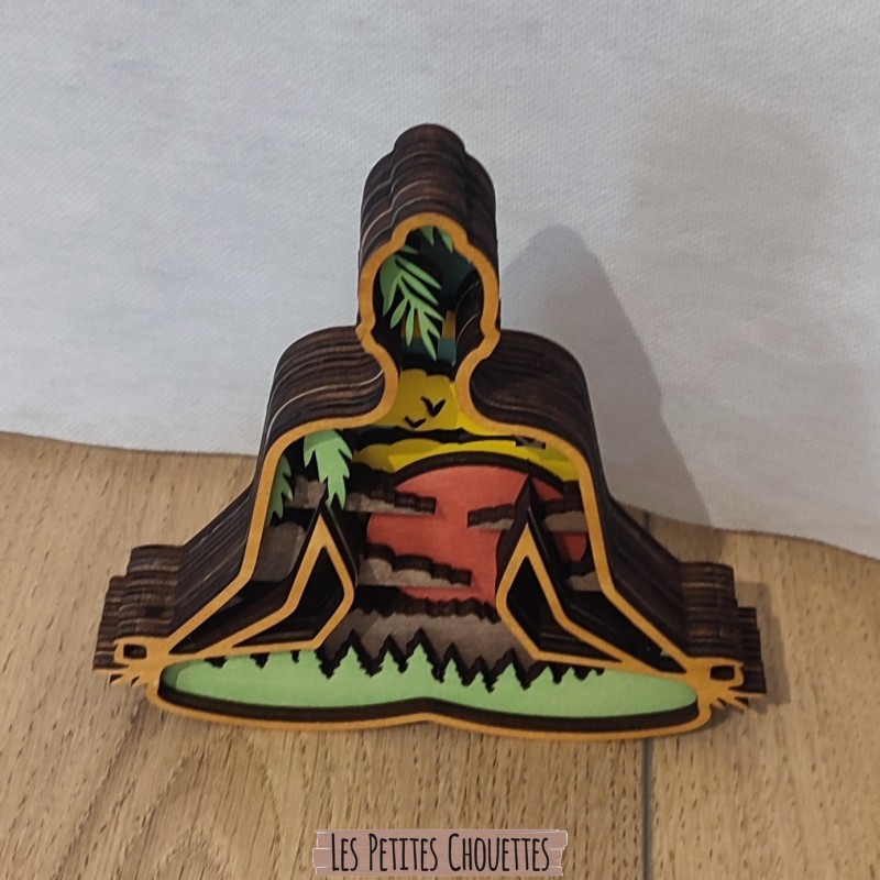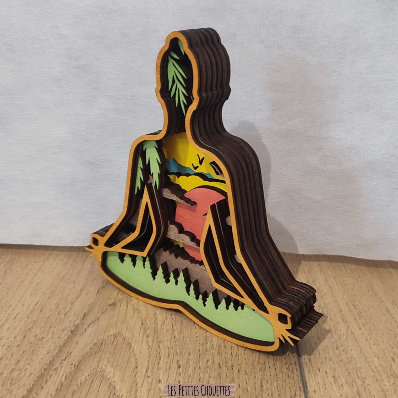Réalisé à partir de plusieurs couches de bois découpées avec précision au laser, ce Zen dévoile en son intérieur un magnifique paysage de forêt avec arbres, soleil, oiseaux, végétation et reliefs qui créent un effet de profondeur très esthétique. Les différentes teintes de bois et la touche de couleur marron, jaune, vert et orange apportent une ambiance douce et chaleureuse.