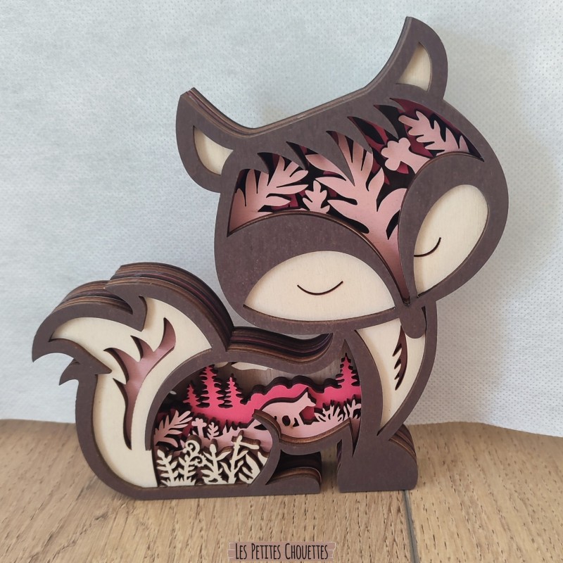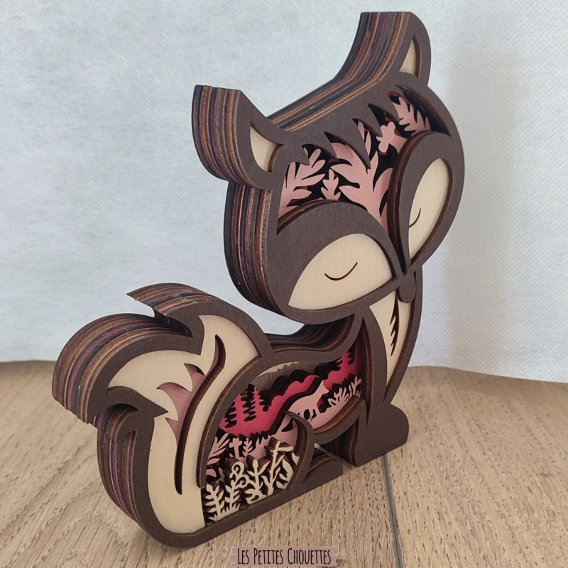 Réalisé à partir de plusieurs couches de bois découpées avec précision au laser, ce renard dévoile en son intérieur un magnifique paysage de forêt avec arbres, végétation et reliefs qui créent un effet de profondeur très esthétique. Les différentes teintes de bois et la touche de couleur rosée apportent une ambiance douce et chaleureuse.