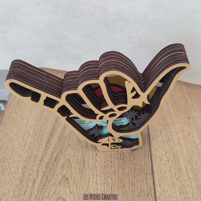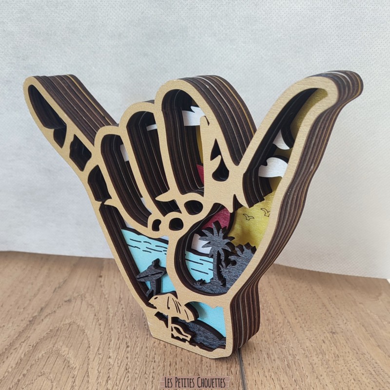 Apportez une touche naturelle et artistique à votre intérieur avec cette sculpture en bois représentant une main shaka surf. À l’intérieur de sa silhouette se dévoile un magnifique paysage de mer avec des vagues, surfeur, palmier, soleil, dune, oiseaux et mer. Une pièce décorative originale, idéale pour les amoureux de la mer, océan et d’artisanat.