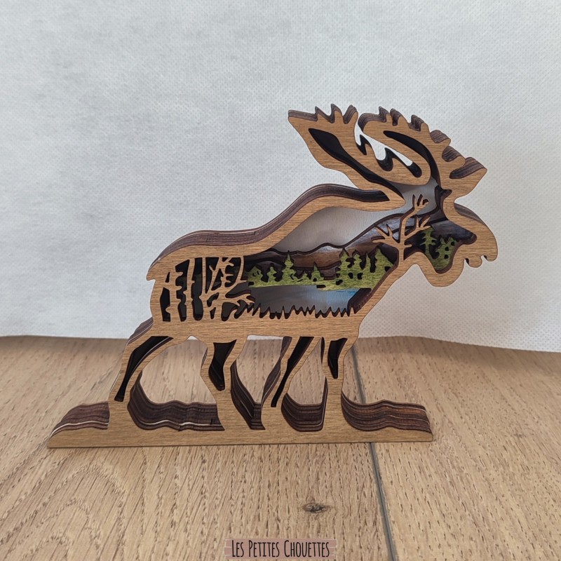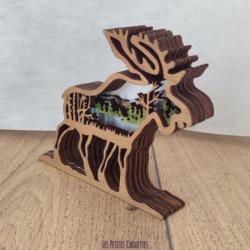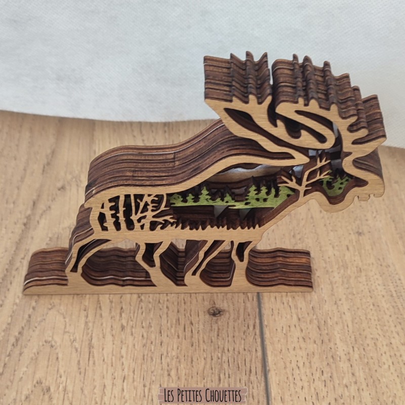 Réalisé à partir de plusieurs couches de bois découpées avec précision au laser, ce cerf dévoile en son intérieur un magnifique paysage de forêt avec arbres, végétation et reliefs qui créent un effet de profondeur très esthétique. Les différentes teintes de bois et la touche de couleur verte apportent une ambiance douce et chaleureuse.