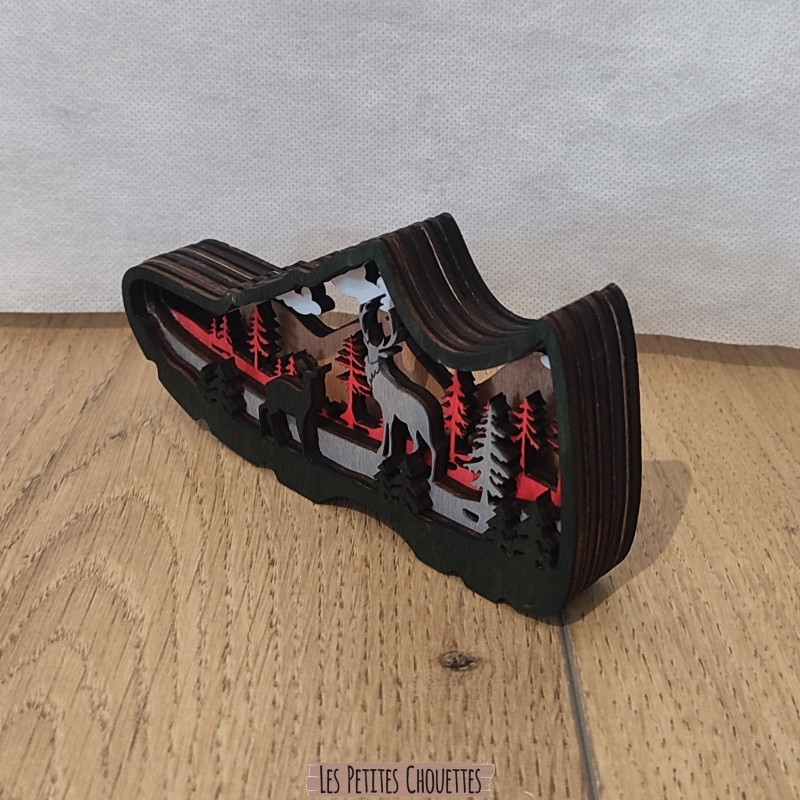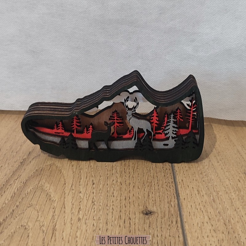 Réalisé à partir de plusieurs couches de bois découpées avec précision au laser, cette Chaussure de randonnée dévoile en son intérieur un magnifique paysage de forêt avec arbres, cerf, biche, végétation et reliefs qui créent un effet de profondeur très esthétique. Les différentes teintes de bois et la touche de couleur noir apportent une ambiance douce et chaleureuse.