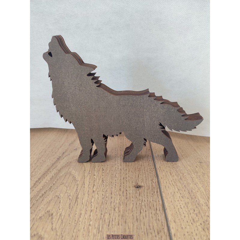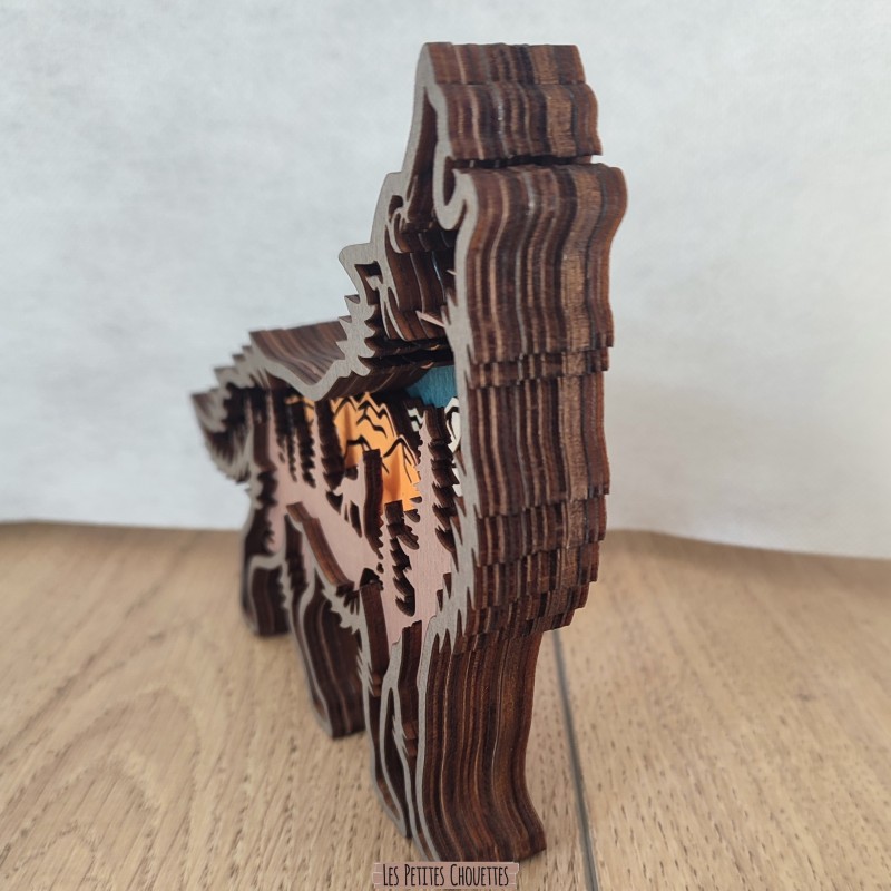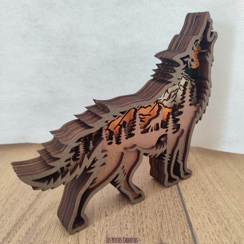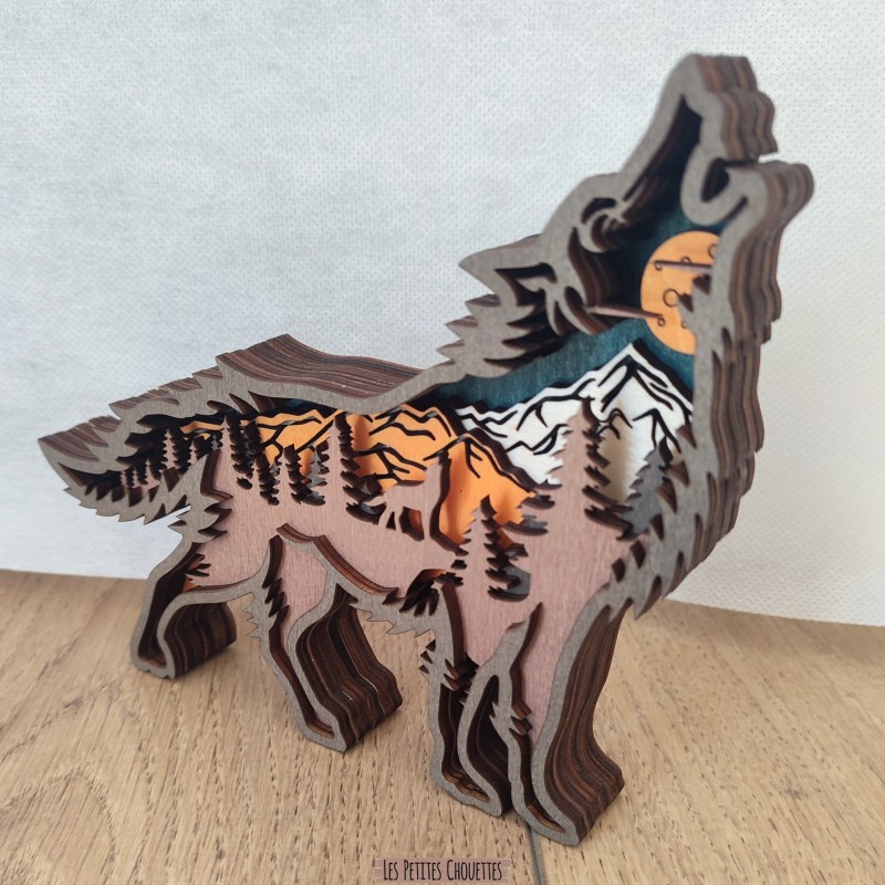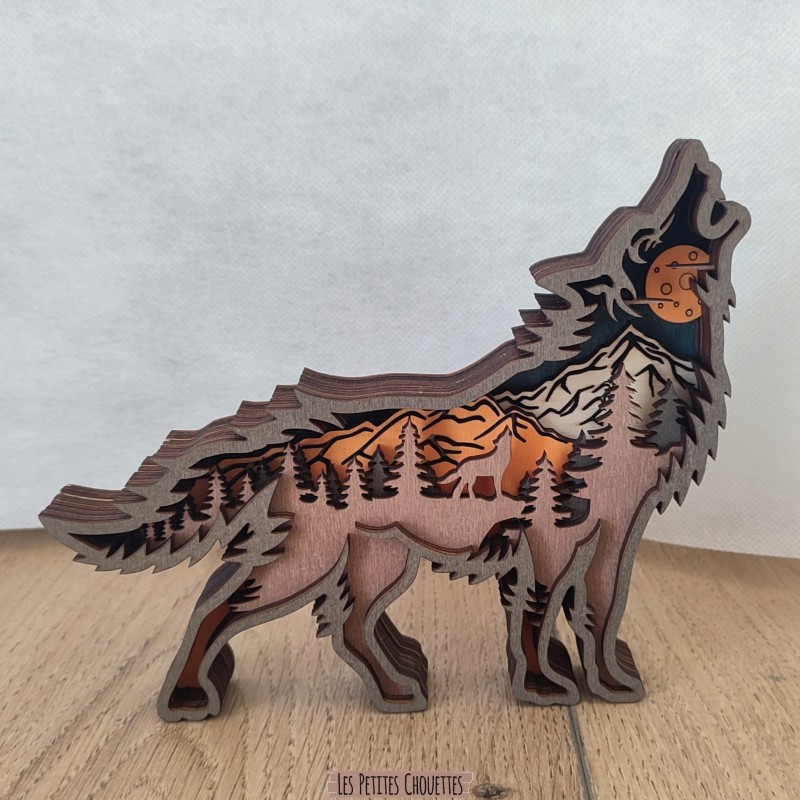 Chaque détail est soigneusement travaillé pour offrir une décoration élégante et originale. Le contraste des différentes couches apporte du relief et met en valeur le paysage naturel intégré dans la forme du loup.
