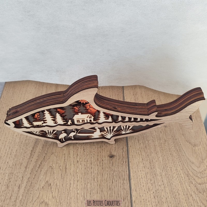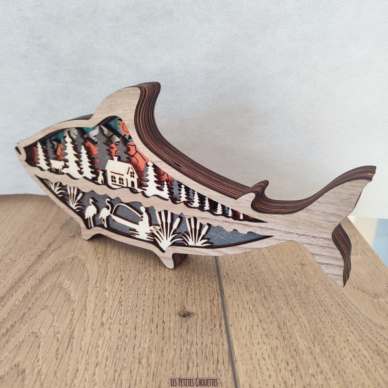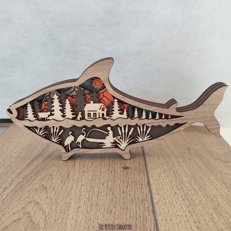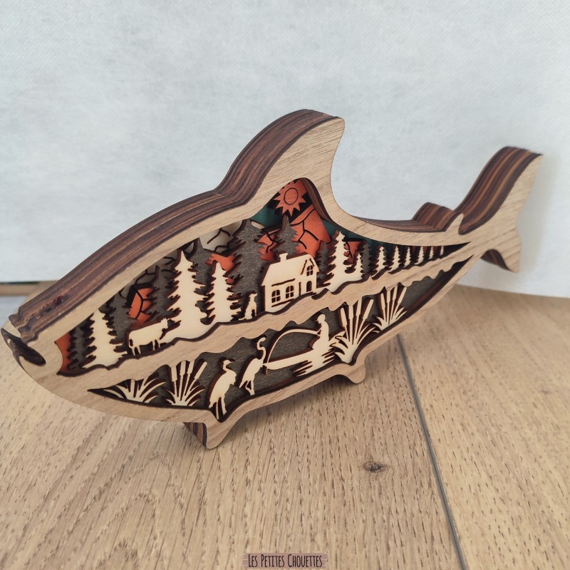Apportez une touche naturelle et artistique à votre intérieur avec cette sculpture en bois représentant un poisson de rivière. À l’intérieur de sa silhouette se dévoile un magnifique paysage de rivière avec un poisson, lac, pécheur, sapin, maison, chien, vache et montagne . Une pièce décorative originale, idéale pour les amoureux de la rivière, lac, montagne et d’artisanat.