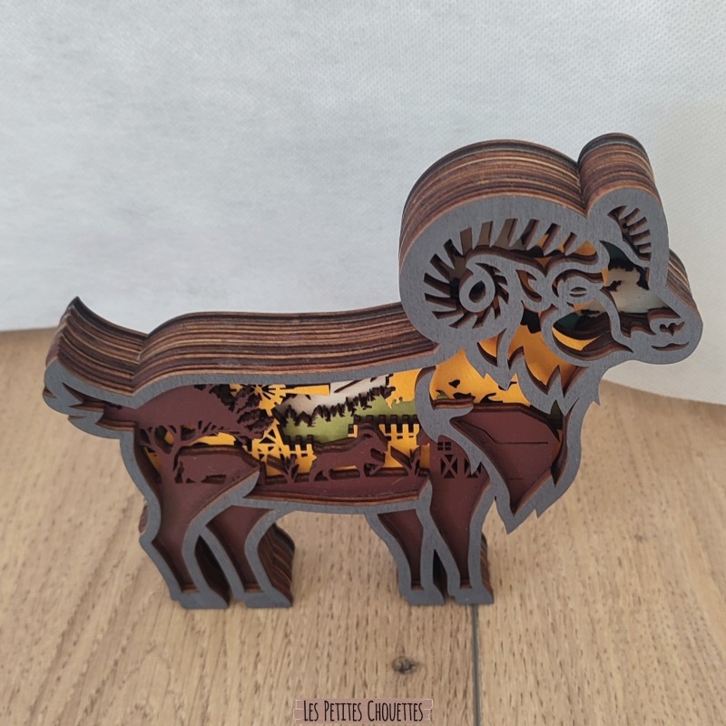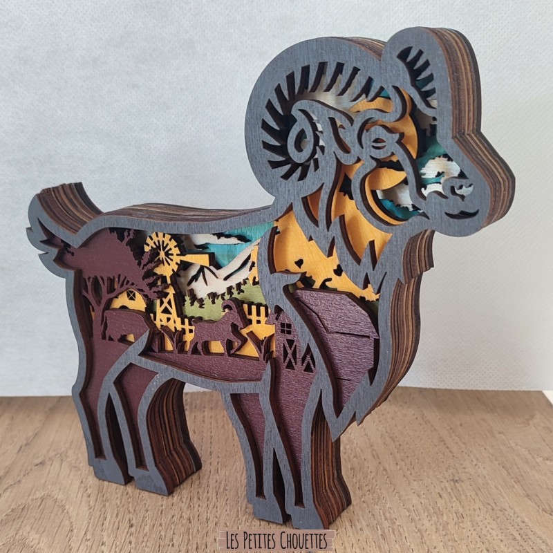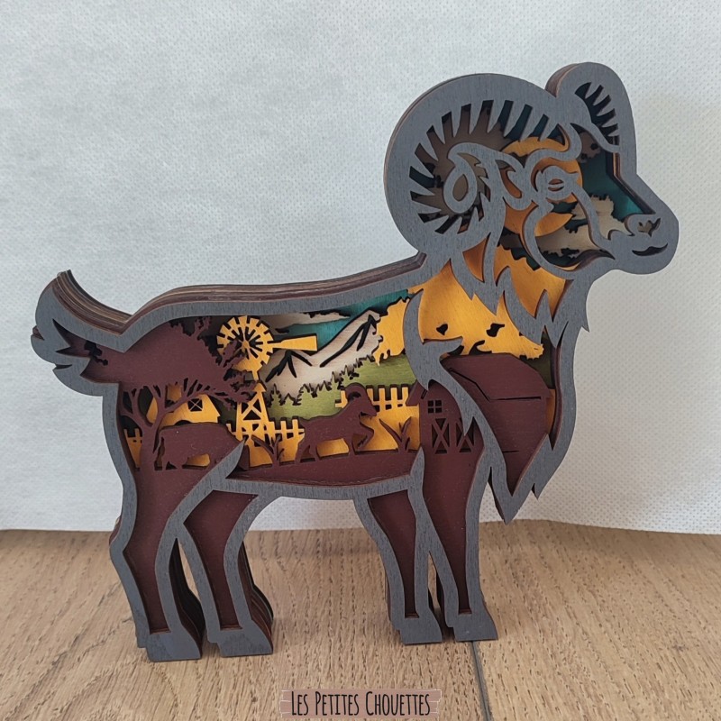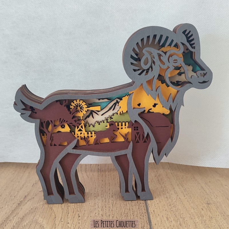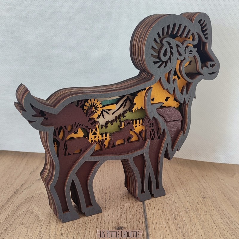 Ajoutez une touche d'authenticité et de nature à votre décoration intérieure avec ce magnifique bélier décoratif en bois sculpté. Réalisé à partir de plusieurs couches de bois découpées avec précision, ce décor révèle un paysage naturel détaillé composé de montagnes, d'arbres, d'une ferme et d'animaux.