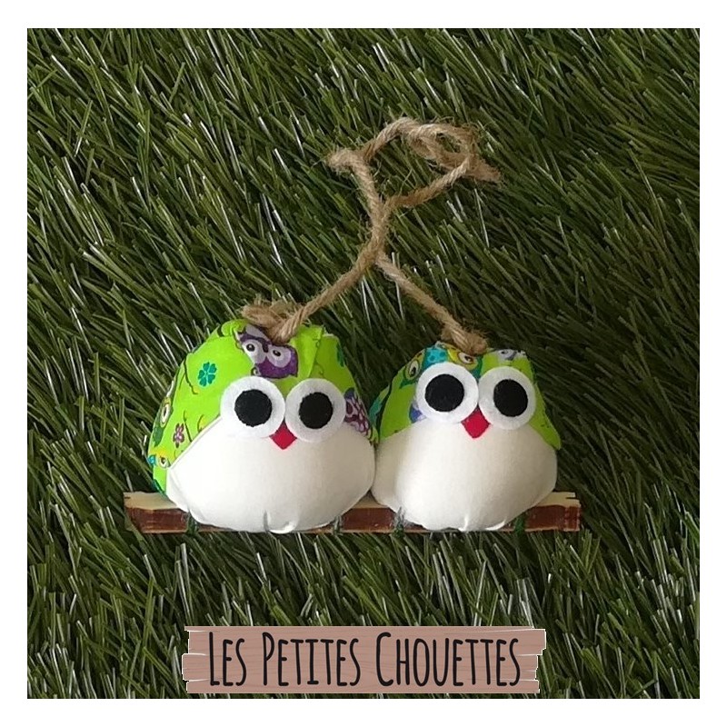 Joli couple composé de 2 chouettes hiboux fabriqué en tissus vert pomme et posé sur une branche symbolise le couple de la famille.