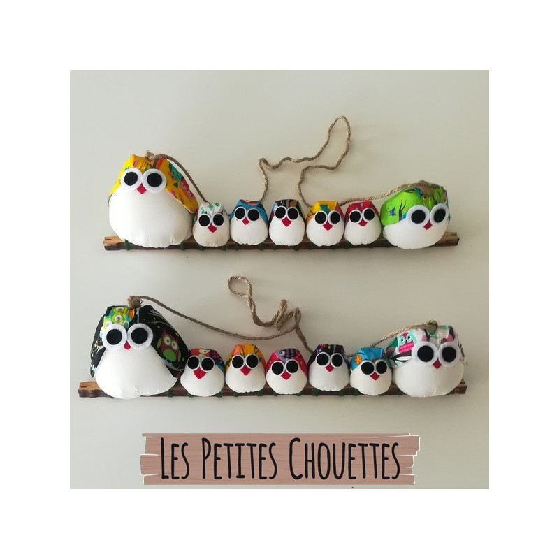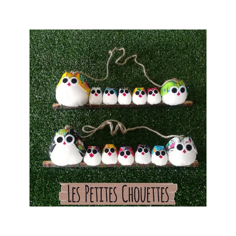Cette jolie famille de 7 chouettes avec tissu mélangé. Personnalisable gratuitement au prénom de chacun.